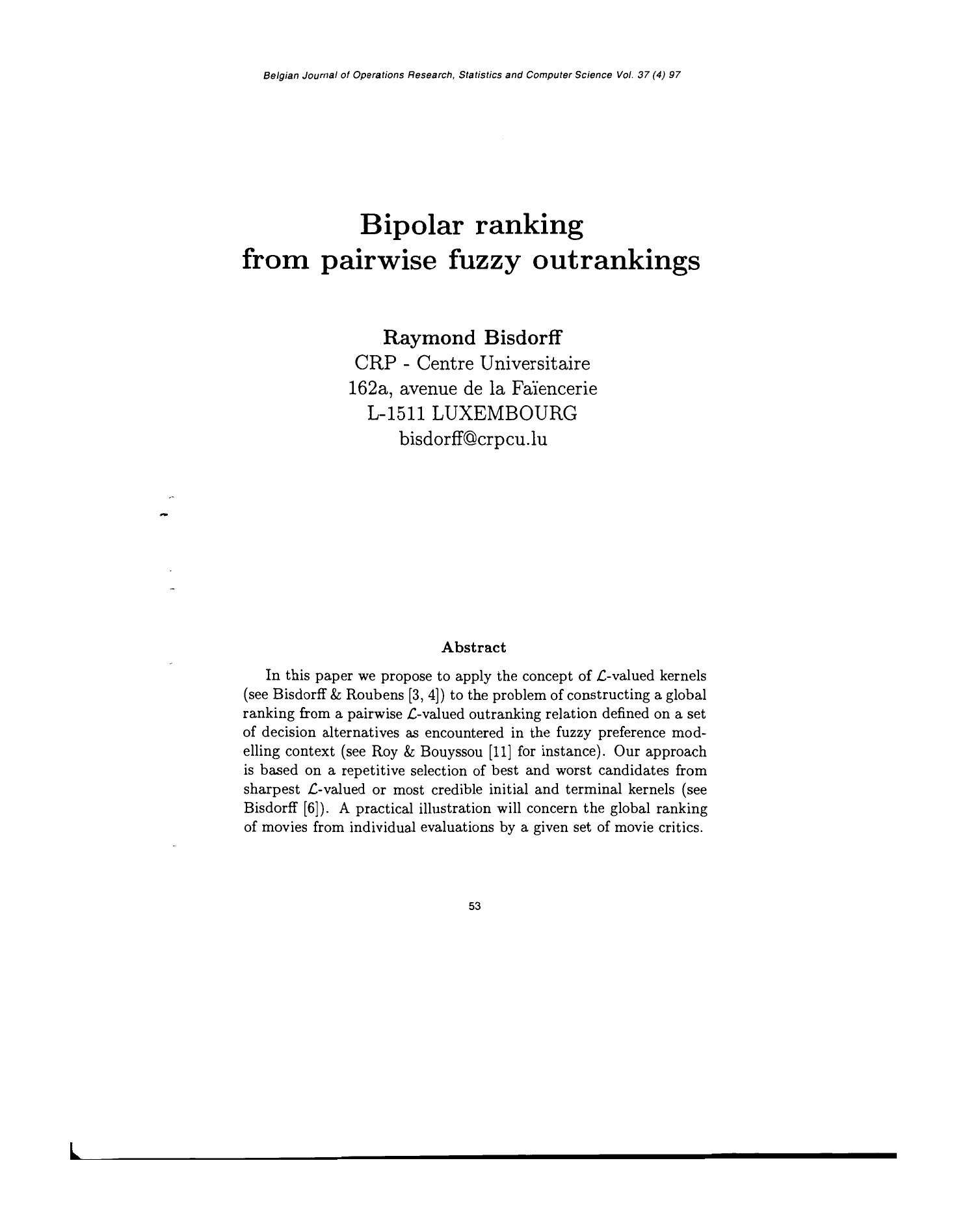 Bisdorff, R. (1997). Bipolar ranking from pairwise fuzzy outrankings. JORBEL - Belgian Journal of Operations Research, Statistics, and Computer Science, 37(4), 53–70. Retrieved from https://orbel.be/jorbel/index.php/jorbel/article/view/276
