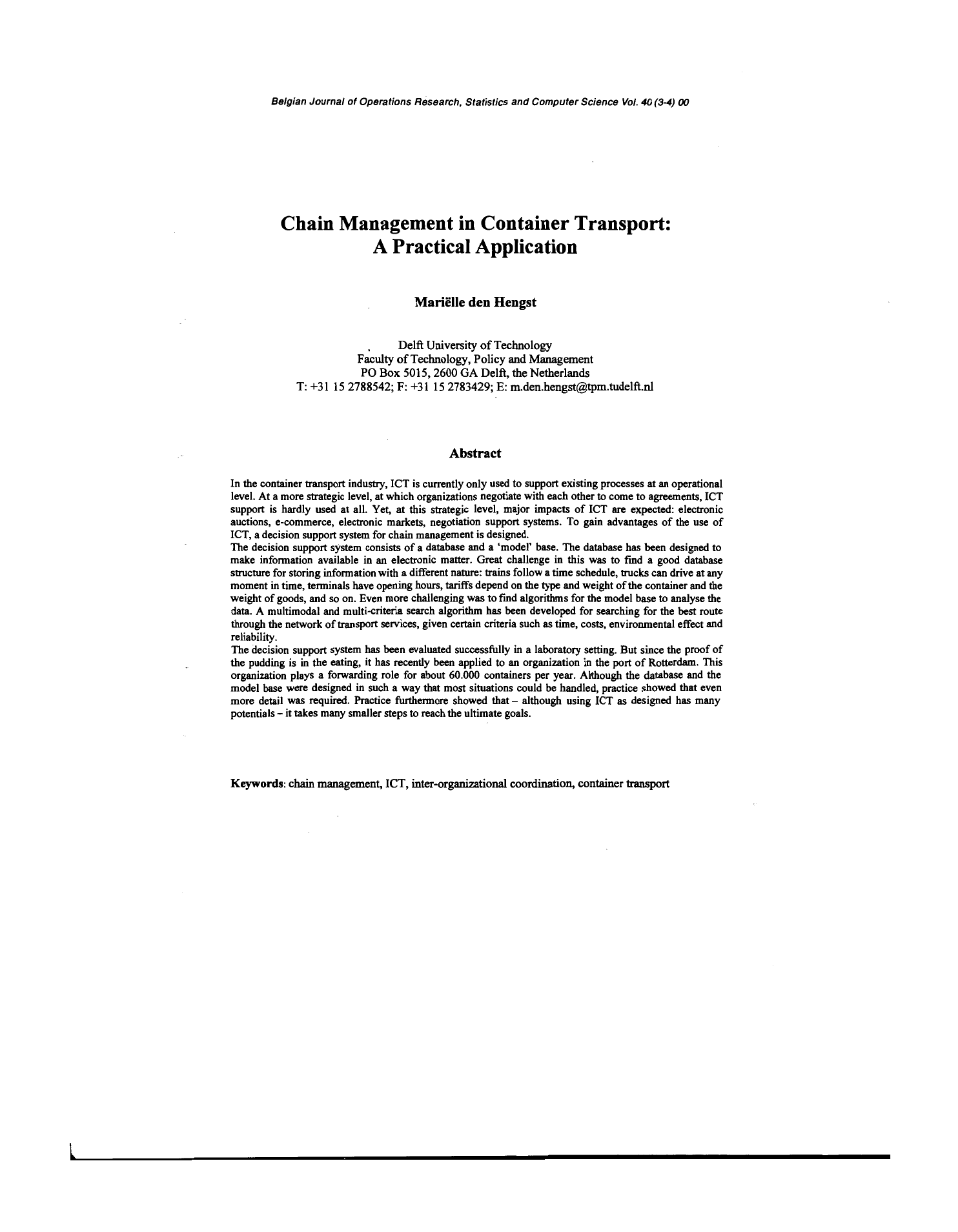reliability. The decision support system has been evaluated successfully in a laboratory setting. But since the proof of the pudding is in the eating, it has recently been applied to an organization in the port of Rotterdam. This organization plays a forwarding role for about 60.000 containers per year. Although the database and the model base were designed in such a way that most situations could be handled, practice showed that even more detail was required. Practice furthermore showed that — although using ICT as designed has many potentials — it takes many smaller steps to reach the ultimate goals.