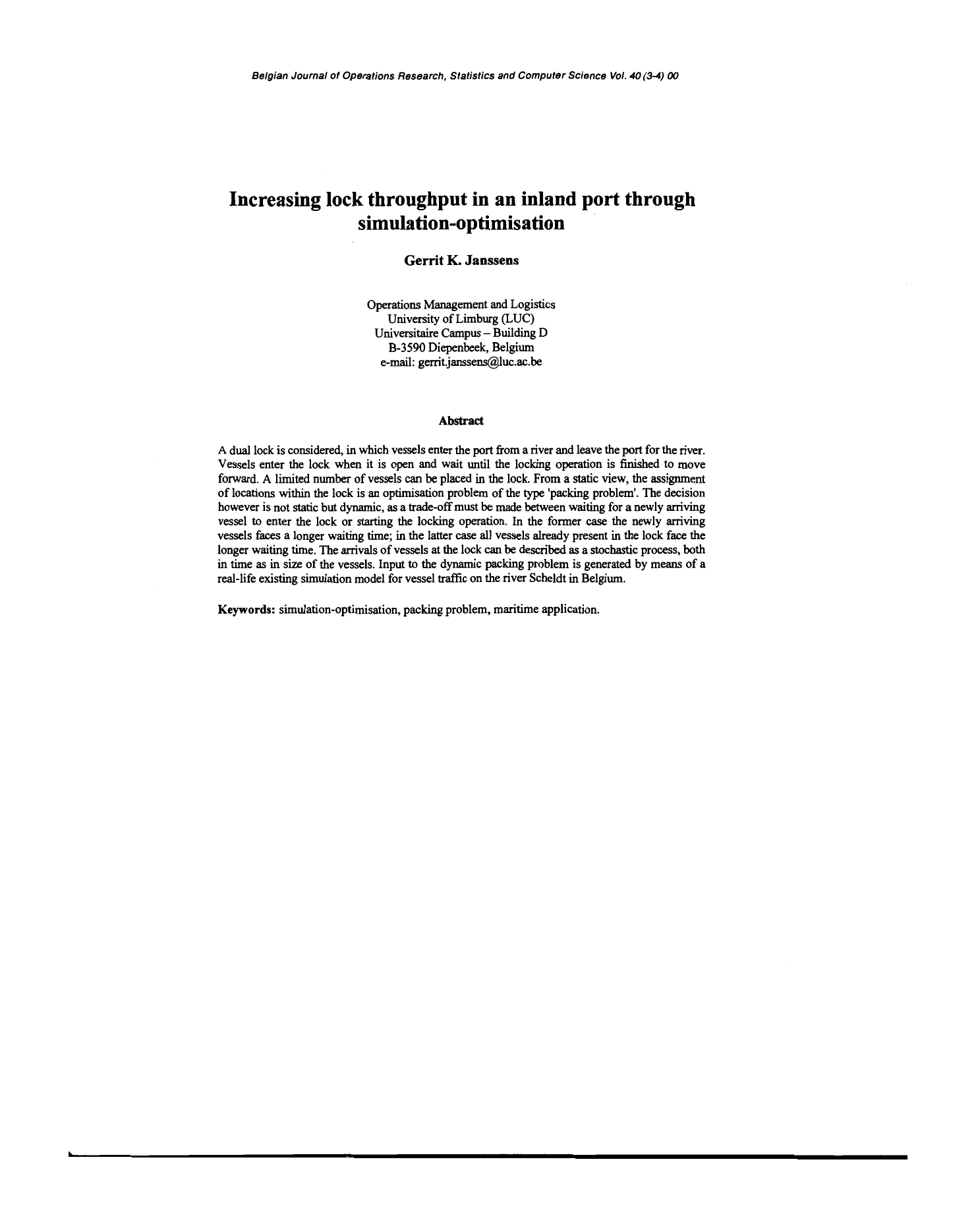 vessel to enter the lock or starting the locking operation. In the former case the newly arriving vessels faces a longer waiting time; in the latter case all vessels already present in the lock face the longer waiting time. The arrivals of vessels at the lock can be described as a stochastic process, both in time as in size of the vessels. Input to the dynamic packing problem is generated by means of a real-life existing simulation model for vessel traffic on the river Scheldt in Belgium.
