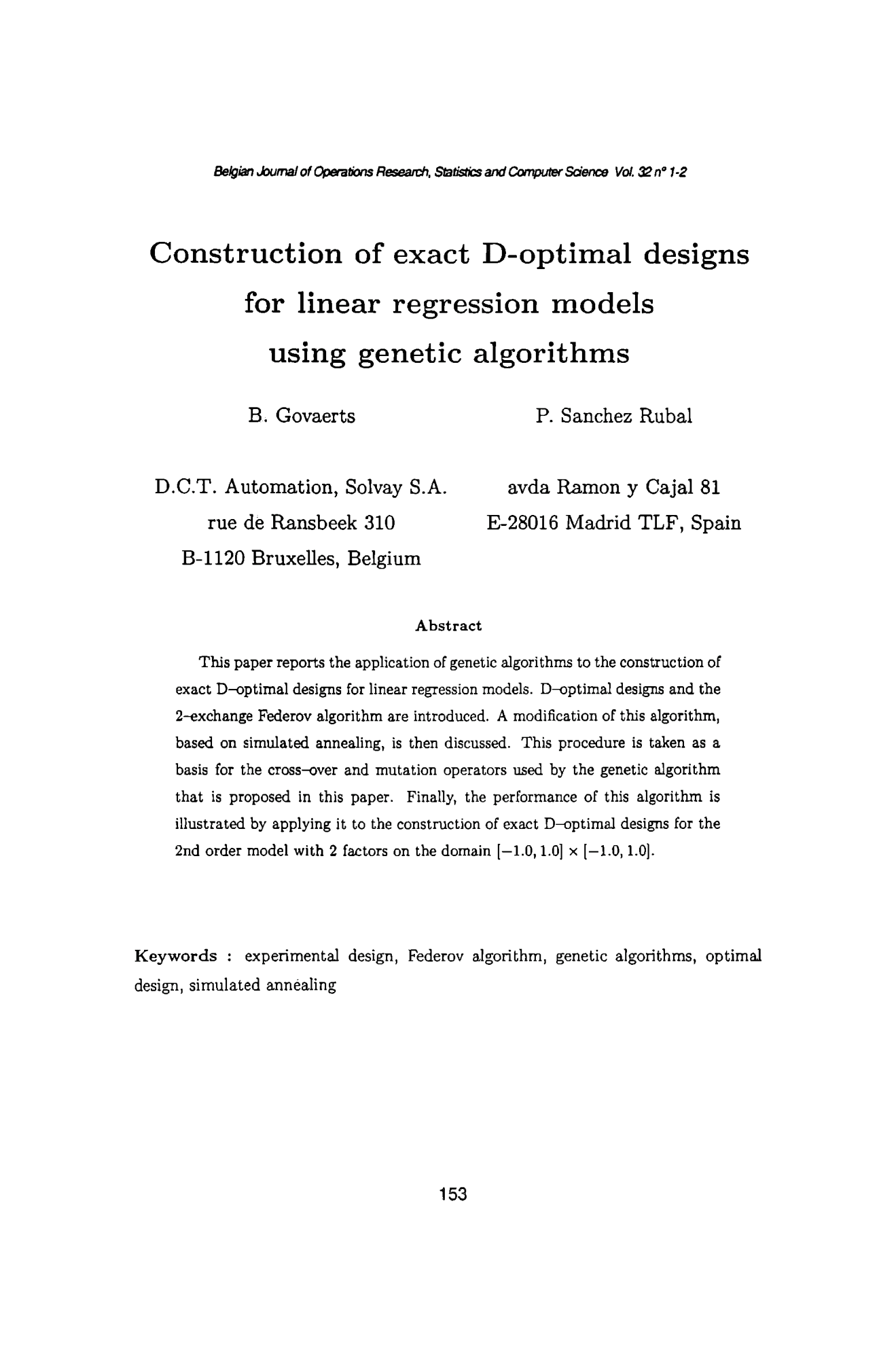 Govaerts, B., & Sanchez Rubal, P. (2020). Construction of exact D-optimal designs for linear regression models using genetic algorithms. JORBEL - Belgian Journal of Operations Research, Statistics, and Computer Science, 32(1, 2), 153–174. Retrieved from https://orbel.be/jorbel/index.php/jorbel/article/view/551