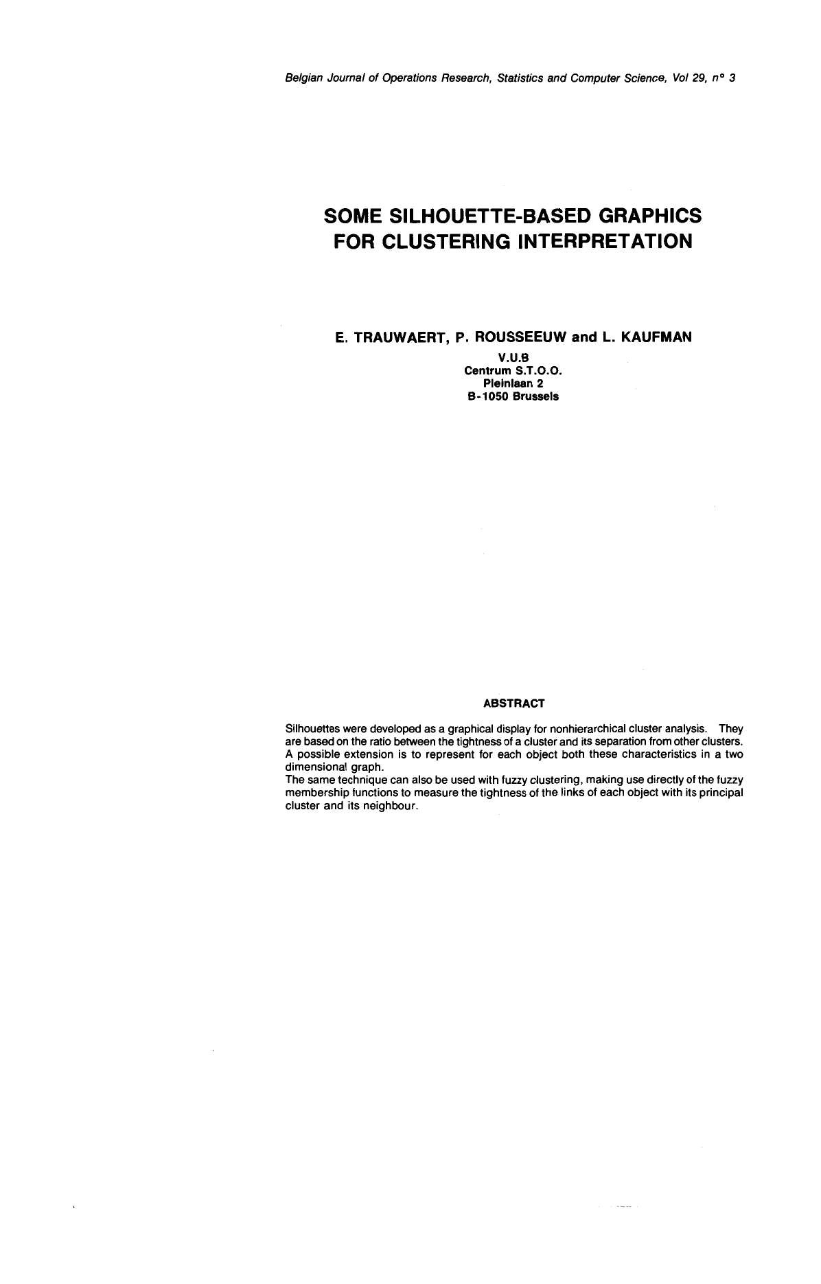 Trauwaert, E., Rousseeuw, P., & Kaufman, L. (1989). Some silhouette-based graphics for clustering interpretation. JORBEL - Belgian Journal of Operations Research, Statistics, and Computer Science, 29(3), 35–55. Retrieved from https://orbel.be/jorbel/index.php/jorbel/article/view/86