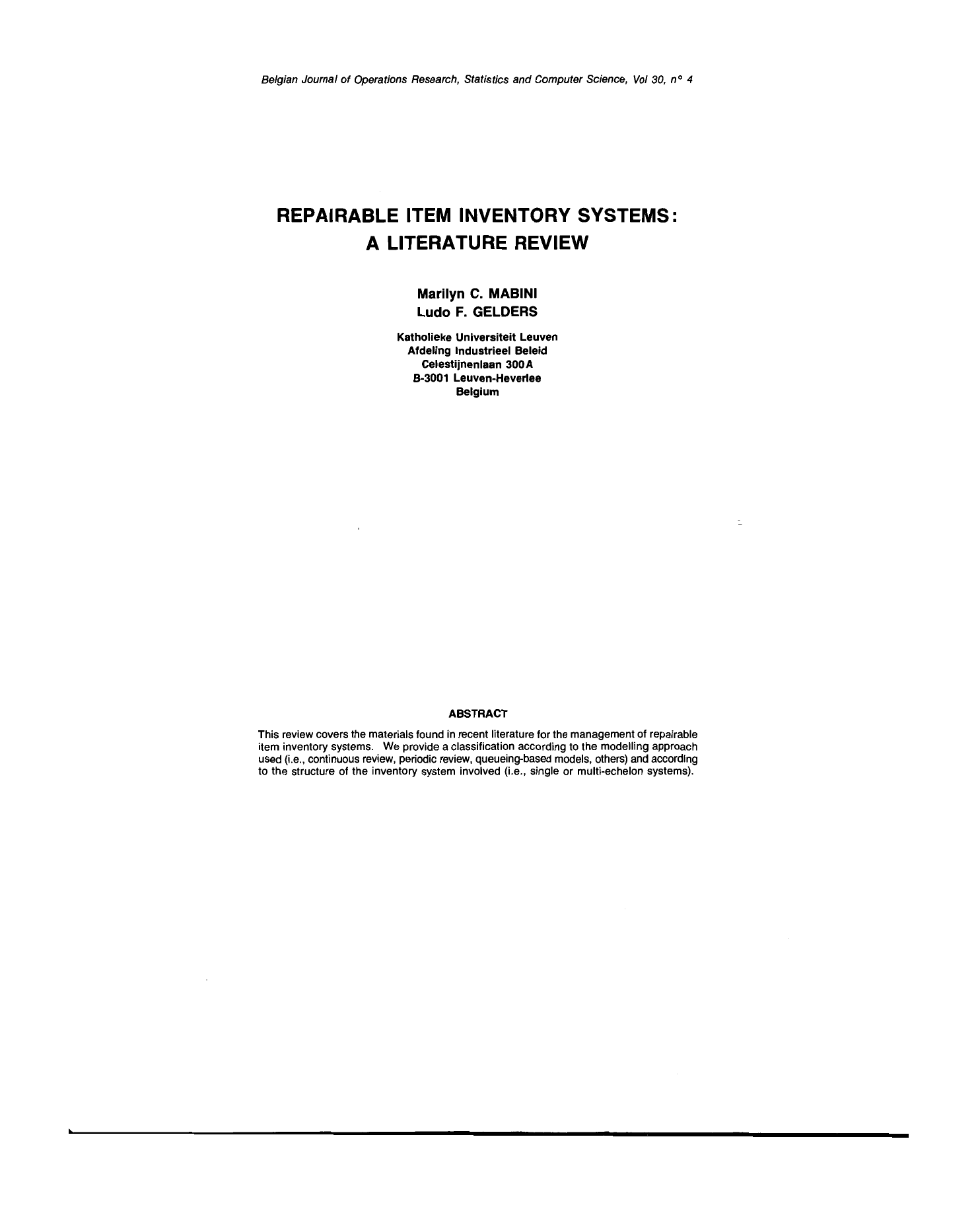 Marini, M. C., & Gelders, L. F. (2019). Repairable item inventory systems: a literature review. JORBEL - Belgian Journal of Operations Research, Statistics, and Computer Science, 30(4), 57–69. Retrieved from https://www.orbel.be/jorbel/index.php/jorbel/article/view/106